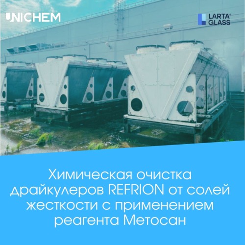 В июле 2025 года к нам обратились специалисты из компании Ларта Гласс Раменское с просьбой оказать помощь с очисткой трех драйкулеров REFRION от налета солей жесткости с применением реагента «Метосан». Каждый теплообменник имеет мощность 933кВт.